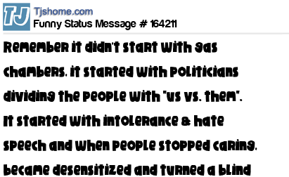 X says Remember it didn't start with gas chambers, it started with politicians dividing the people with "us vs. them". It started with intolerance & hate speech and when people stopped caring, became desensitized and turned a blind eye. This is America in 2016.