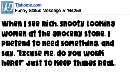 X says When I see rich, snooty looking women at the grocery store, I pretend to need something, and say, "Excuse me, do you work here?" just to keep things real.