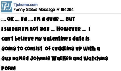 X .... OK .... Ya .... I'm a dude .... But I swear I'm not gay .... However .... I can't believe my Valentine's date is going to consist of cuddling up with a guy named Johnnie Walker and watching porn!