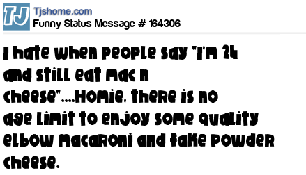 X says I hate when people say "I'm 24 and still eat mac n cheese"....Homie, there is no age limit to enjoy some quality elbow macaroni and fake powder cheese.