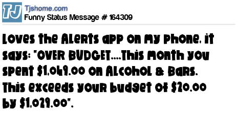X says Loves the Alerts app on my phone, it says: "OVER BUDGET....This month you spent $1,049.00 on Alcohol & Bars. This exceeds your budget of $20.00 by $1,029.00".