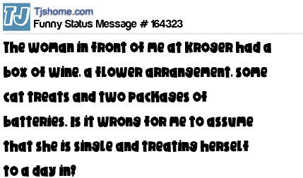 X The woman in front of me at Kroger had a box of wine, a flower arrangement, some cat treats and two packages of batteries. Is it wrong for me to assume that she is single and treating herself to a day in?