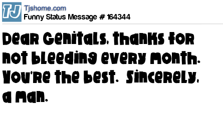 - # 98266 Dear Genitals, Thank you for not bleeding every month. Sincerely, A Man