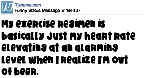X says My exercise regimen is basically just my heart rate elevating at an alarming level when I realize I'm out of beer.