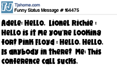 X says Adele: Hello. Lionel Richie : Hello is it me you're looking for? Pink Floyd : Hello. Hello. Is anybody in there? Me: This conference call sucks.