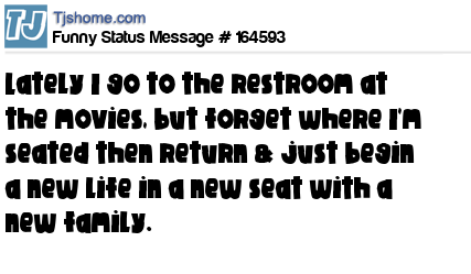 - # 168453 Lately I go to the restroom at the movies, but forget where I'm seated then return and just begin a new life in a new seat with a new family.