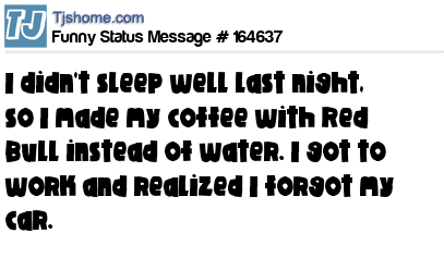 - # 147520 I DIDN'T SLEEP WELL LAST NIGHT, SO I MADE MY COFFEE THIS MORNING WITH RED BULL INSTEAD OF WATER.............I GOT HALF WAY TO WORK BEFORE I REALIZED I FORGOT MY CAR!!!
