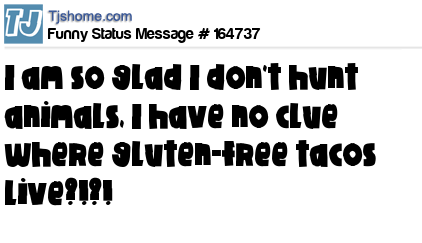 X says I am so glad I don't hunt animals, I have no clue where gluten-free tacos live?!?!