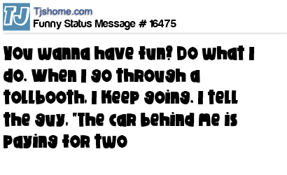 - # 20202 You wanna have laughs? Do what I do. When I go through a tollbooth, I keep going. I tell the guy, "The car behind me is paying for two."