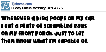 - # 67340 Whenever a bird poops on my car I eat a plate of scrambled eggs on my front porch just to let them know what I'm capable of!