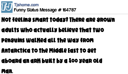X says Not feeling smart today? There are grown adults who actually believe that two penguins walked all the way from Antarctica to the Middle East to get aboard an ark built by a 500 year old man.