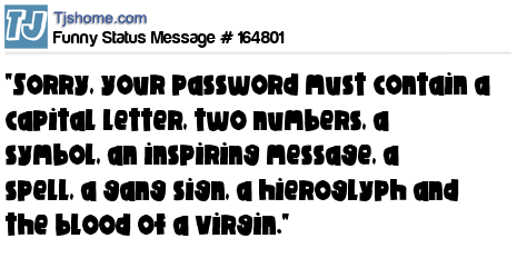 - # 133195 Sorry, your password should contain a capital letter, two numbers, a symbol, an inspiring message, a spell, a gang sign, a hieroglyph & blood of a virgin!