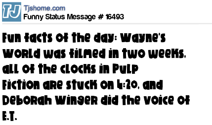 X fun facts of the day: Wayne's World was filmed in two weeks, all of the clocks in Pulp Fiction are stuck on 4:20, and Deborah Winger did the voice of E.T.