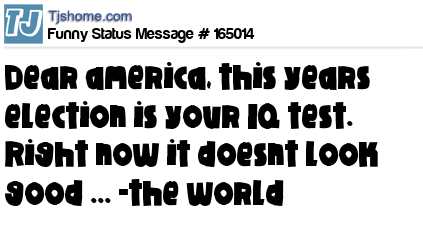 - # 164958 America, you might call this a presidential election, but the rest of the world is viewing it as your IQ test. And it's not looking good....