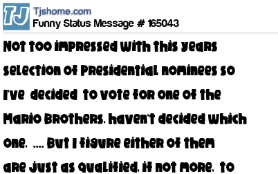 X says Not too impressed with this years selection of Presidential nominees so I've decided to vote for one of the Mario Brothers, haven't decided which one, .... But I figure either of them are just as qualified, if not more, to fix things as the nominees.