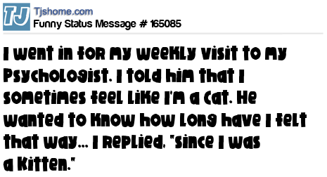 - # 197148 Saturday morning wife took me in for my weekly visit to my Psychologist. I told him that I sometimes feel like I'm a Cat. He wanted to know how long have I felt that way... I replied, "since I was a Kitten."