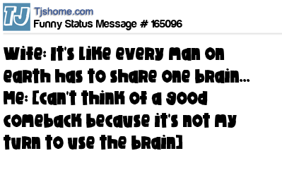 - # 198878 Wife: It's like every man on earth has to share one brain !!!👿 Wife: Well aren't you gonna say something ? Me : Not my turn to use the brain.😜