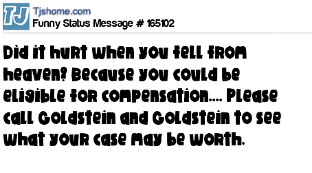 X says Did it hurt when you fell from heaven? Because you could be eligible for compensation.... Please call Goldstein and Goldstein to see what your case may be worth.