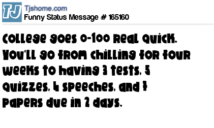 X says College goes 0-100 real quick. You'll go from chilling for four weeks to having 3 tests, 5 quizzes, 4 speeches, and 7 papers due in 2 days.