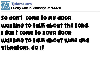 - # 165204 Stop knocking on my door wanting to talk about the Lord and I will stop coming to your door wanting to talk about alcohol, weed and freaky sex.