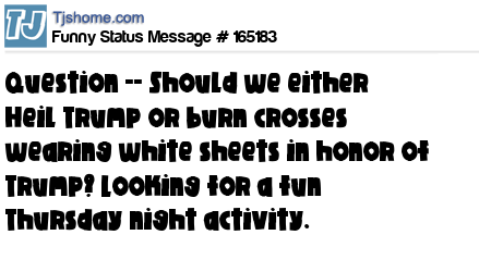 X says Question -- Should we either Heil Trump or burn crosses wearing white sheets in honor of Trump? Looking for a fun Thursday night activity.