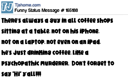 X says There's always a guy in all coffee shops sitting at a table, not on his iPhone, not on a laptop, not even on an iPad, he's just drinking coffee, like a psychopathic murderer. Don't forget to say "Hi" y'all!!!