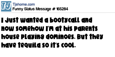 X says I just wanted a bootycall and now somehow I'm at his parents house playing dominoes. But they have tequila so it's cool.