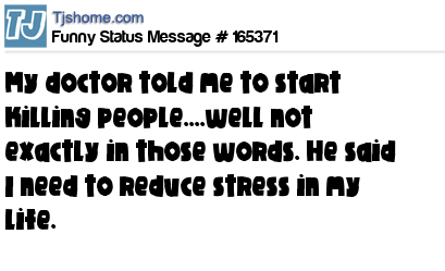 - # 105983 My doctor told me to start killing people. Well, not in those exact words. He said I had to reduce the stress in my life. Same thing!