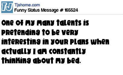 X says One of my many talents is pretending to be very interesting in your plans when actually I am constantly thinking about my bed.