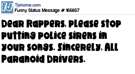 - # 124582 Dear rappers, please stop putting police sirens in your music. When I'm driving it scares the crap out of me.