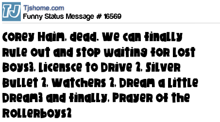 X says Corey Haim, dead. We can finally rule out and stop waiting for Lost Boys3, Licensce to Drive 2, Silver Bullet 2, Watchers 2, Dream a Little Dream3 and finally, Prayer of the Rollerboys2