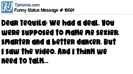 X says Dear Tequila: We had a deal. You were supposed to make me sexier, smarter and a better dancer. But I saw the video. And I think we need to talk...