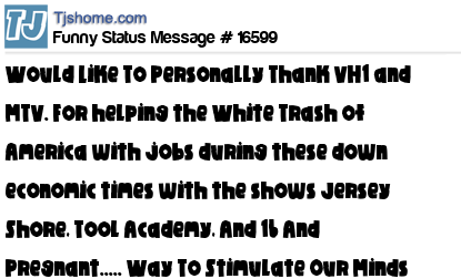 X is Would Like To Personally Thank VH1 and MTV. For helping the White Trash of America with jobs during these down economic times with the shows Jersey Shore, Tool Academy, And 16 And Pregnant..... Way To Stimulate Our Minds And Economy.