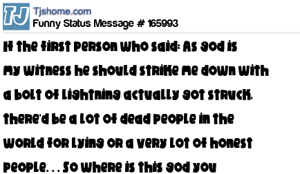 X says If the first person who said: As god is my witness he should strike me down with a bolt of lightning actually got struck, there'd be a lot of dead people in the world for lying or a very lot of honest people. . . So where is this god you speak of.