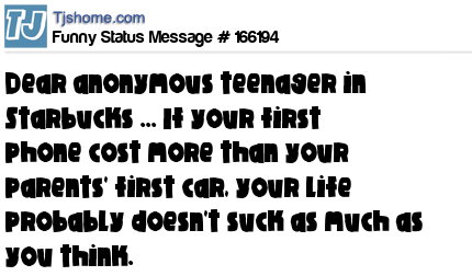 X says Dear anonymous teenager in Starbucks ... If your first phone cost more than your parents' first car, your life probably doesn't suck as much as you think.