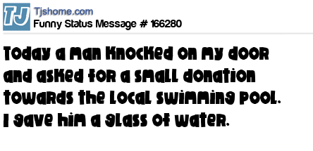X says Today a man knocked on my door and asked for a small donation towards the local swimming pool. I gave him a glass of water.