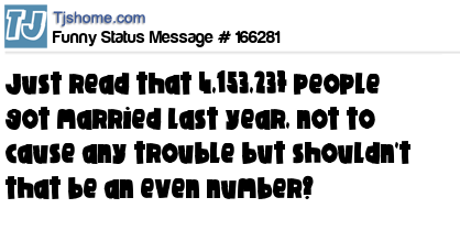 - # 36243 I just read that 4,153,237 people got married last year, I don't want to start any trouble, but shouldn't that be an even number?