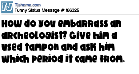 X says How do you embarrass an archeologist? Give him a used tampon and ask him which period it came from.