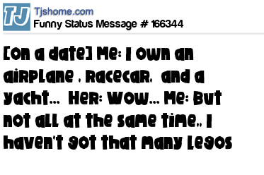 X says [on a date] Me: I own an airplane , racecar, and a yacht... Her: Wow... Me: But not all at the same time,, I haven't got that many Legos