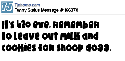 X It's 420 eve, remember to leave out milk and cookies for snoop dogg.