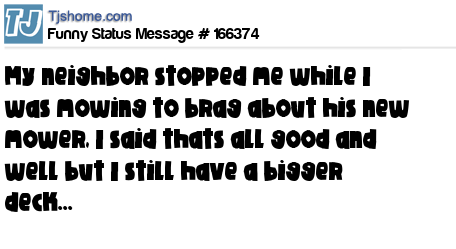 X says My neighbor stopped me while I was mowing to brag about his new mower, I said thats all good and well but I still have a bigger deck...