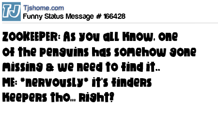 X says ZOOKEEPER: As you all know, one of the penguins has somehow gone missing & we need to find it.. ME: *nervously* it's finders keepers tho,,, right?