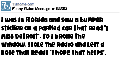 X says I was in Florida and saw a bumper sticker on a parked car that read "I miss Detroit". So I broke the window, stole the radio and left a note that reads "I hope that helps".