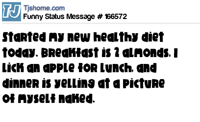 - # 205515 Started my new healthy diet today. Breakfast is 2 almonds, I lick an apple twice for lunch, and dinner is yelling at a picture of myself naked.