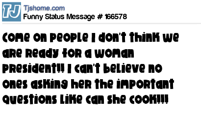 X is Come on people I don't think we are ready for a woman president!! I can't believe no ones asking her the important questions like can she cook!!!