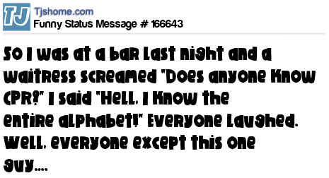 - # 172025 Bar waitress: "ANYONE KNOW CPR?!"... Me: "Hell, I know the entire alphabet!"... Then everyone laughed & laughed. Well, except that one guy.