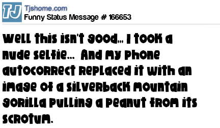 X says Well this isn't good,,, I took a nude selfie...  And my phone autocorrect replaced it with an image of a silverback mountain gorilla pulling a peanut from its scrotum.