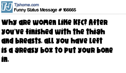 X says Why are women like KFC? After you've finished with the thigh and breasts, all you have left is a greasy box to put your bone in.