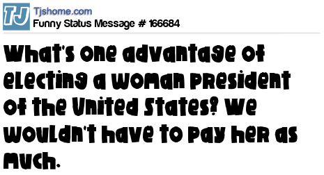 X says What's one advantage of electing a woman president of the United States? We wouldn't have to pay her as much.