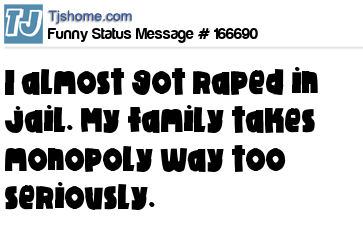 - # 183108 I almost got raped in jail once. My family takes Monopoly way too seriously.